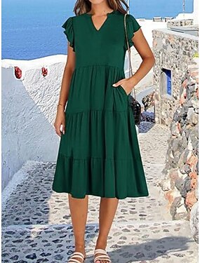 Femmes Robe Midi Faux coton lin Robe Chemise Robe Décontractée Basique Moderne Quotidien Week-end Coupe Ample Uni Manche 3/4 Col en V Bleu Noir Rose Claire Vin Été Printemps
