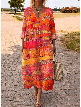 Robe mi-longue femme à col en V manches longues caftan léger coupe ample robe évasée décontractée boho sortie graphique géométrique à rayures manches longues col en V rouge orange noir jaune rose