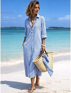 Femmes Robe maxi Robe fourreau Robe d'Été Vacances Occasionnel Extérieur Sortir Coupe régulière Rayure manche longue Col Rabattu Bleu Rose Claire Rouge Café Été Printemps Automne