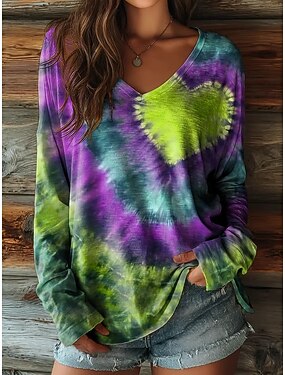 Femmes T-shirt Imprimé Cœur Teinture par nouage ancien Occasionnel Boho manche longue Col en V Hauts Réguliers Quotidien Bleu Jaune Rouge Violet Vert Printemps Automne