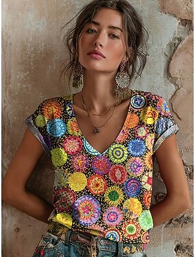 Femmes T-shirt Imprimé Fleuri Graffiti Bohème ancien Occasionnel Manche Courte Col en V Hauts Réguliers Quotidien Arc-en-ciel Été Printemps