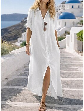 Femmes Robe maxi Faux coton lin Robe Chemise Robe Décontractée Basique Occasionnel Quotidien Vacances Coupe régulière Uni manche longue Col de chemise Blanche Vert Claire Rose Claire Été