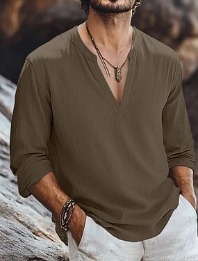 Homme Chemise Chemise en lin Style Viking Chemise d'été Tenue de plage Couleur Unie Extérieur Vacances Vert Beige manche longue Col en V Été Printemps Vêtement Tenue