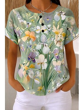 T-shirt gaufré femme, haut d'été, imprimé color block, motif géométrique, plantes, style vintage, élégant, classique, manches courtes, col rond, coupe droite, décontracté, quotidien, vert arc-en-ciel,