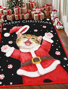 Tapis de Noël chat du Père Noël pour salon et chambre tapis en faux cachemire avec un joli chaton en costume de Noël tapis doux antidérapant lavable en machine 5x7 pieds CandySnow par Kayomi Harai