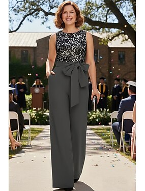 Combinaison Tailleur-Pantalon Trois Pièces Longueur au sol Robe de Mère de Mariée Sans manches Col carré Élégant Grande taille Formel robe demoiselle d honneur Chiffon Dentelle à Cordon Echarpe