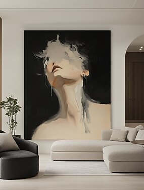 Peinture abstraite minimaliste moderne faite à la main, silhouette noire et beige, art en noir et blanc, fond neutre texturé, décoration murale contemporaine