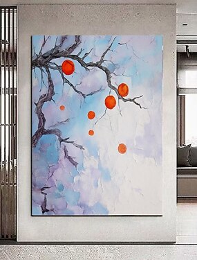 Peinture acrylique texturée à la main représentant un kaki, art abstrait d'arbre fait main, décoration murale personnalisée de style chinois pour salle à manger