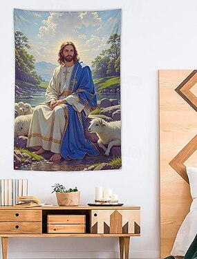 Tapisserie murale représentant Jésus-Christ, le Bon Berger, avec ses agneaux, vêtu d'une robe blanche et d'un manteau bleu. Décoration religieuse chrétienne pour chambre, salon ou église. Paysage