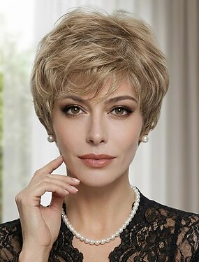 Perruque synthétique courte et moderne de style pixie pour femme - blonde platine avec des mèches subtiles et un volume texturé