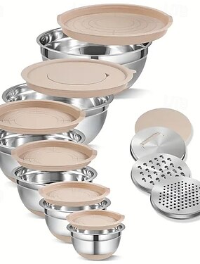 Ensemble de bols mélangeurs en métal, comprenant un bol mélangeur pour pâtisserie, des bols mélangeurs pour salade avec base antidérapante et 6 bols gigognes en acier inoxydable kaki.
