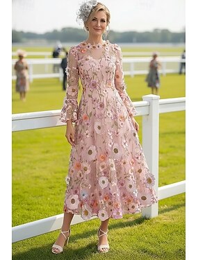 Ligne A Longueur cheville Longueur thé Robe de Cocktail Robe d'invité de mariage Robes de Cocktail Élégant ancien manche longue Col ras du cou Formel Kentucky Derby Dentelle Tulle avec Broderie