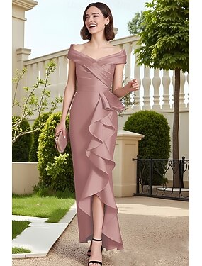 Fourreau Colonne Mi-long Robe de Soirée Robe de Cocktail Robe d'invité de mariage Robe de Mère de Mariée Sans manches Épaules Dénudées Élégant Formel Kentucky Derby Satin avec Froncé Fronces