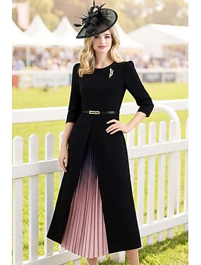 A-Ligne Robe de Fête Longueur Thé Robe de Cocktail Robe d'Invité de Mariage Robe de Mère de la Mariée Manches Longues Col Ronde Élégante Vintage Fête Spandex avec Plis Couleur Bloquée