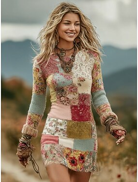 Femmes Mini Robe Robe Pull Vacances Occasionnel Boho Quotidien Fête Sortir Mince Fleuri Graphique Tribal manche longue Col ras du cou Col Bénitier Rose Claire Automne Hiver