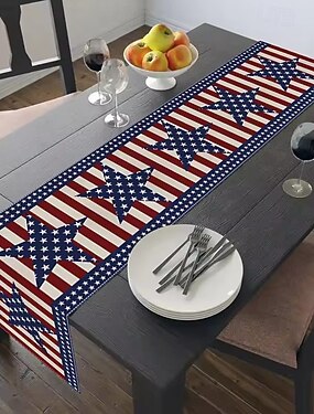 Chemin de table 33 cm x 275 cm (1 pièce), motif étoiles bleues et blanches, thème fête nationale américaine (4 juillet), décoration patriotique pour la cuisine.