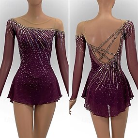 Robe de patinage artistique Femmes Fille Patinage Robe Rouge Bordeaux Patchwork Dos Nu Maille Spandex Haute Élasticité Entraînement Compétition Tenue de Patinage Classique cristal pailleté manche