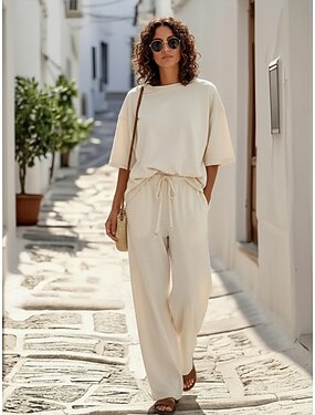 Ensemble pantalon femme 15% lin, basique, couleur unie, poche, taille élastique, t-shirt, manches longues, col rond, bleu, noir, blanc, bleu marine, marron clair, été, printemps