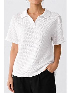 Femmes Tee-shirt Gaufre T-shirt Œillet Couleur Unie Élégant Mode Occasionnel Manche Courte Col en V Col de chemise Hauts Réguliers Quotidien Sortir Vêtements de vacances Noir Blanche Kaki Ét
