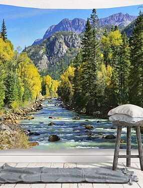 Tapisserie murale représentant un paysage de montagne, de forêt et de rivière, avec des pins et un ruisseau, idéale pour la décoration du salon et de la chambre.