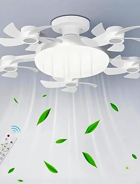 Ventilateur de plafond avec éclairage, télécommande, 3 vitesses, 3 couleurs, 2 minuteries, moteur silencieux, ampoules E26/E27, pales pliables, pour salon ou chambre.