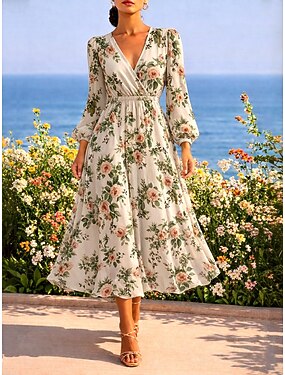 Femmes Robe Midi Robe Plissée Robe moulante Robe ajustée et évasée Anniversaire Occasionnel Formel Bureau Date Coupe régulière Fleuri Graphique manche longue Col en V Beige Été Printemps