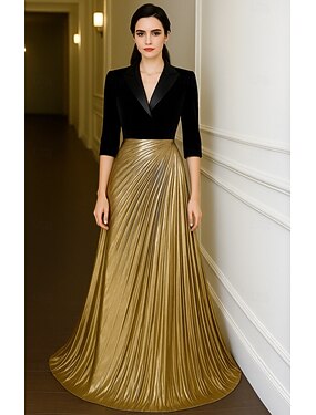 Femmes Robe smoking Ligne A Mariage Formel robe demoiselle d honneur Velours Élégant Bloc de Couleur Demi Manches Longueur au sol Revers crantés