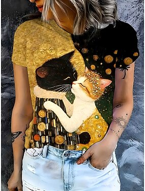 Femmes T-shirt Imprimé Graphique Animal Chat ancien Élégant Classique Manche Courte Col ras du cou Col rond Hauts Réguliers Quotidien Week-end Dorée Été Printemps Automne