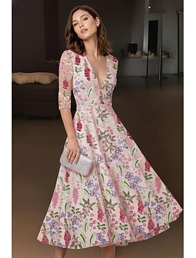 Ligne A Longueur thé Robes de Cocktail Élégant ancien Floral Demi Manches Col en V Fête de jardin Mariage Dentelle avec Fleur brodée Broderie Poche