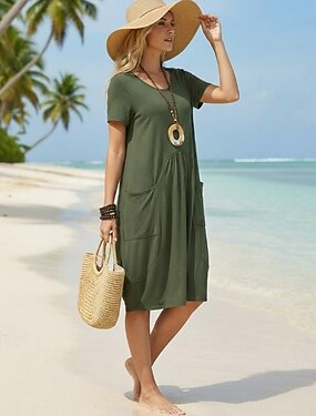 Femmes Mini Robe Faux coton lin Robe Décontractée Élégant Basique Occasionnel Quotidien Vacances Coupe régulière Uni Manche Courte Col en V Noir Kaki Vert Véronèse Été Printemps