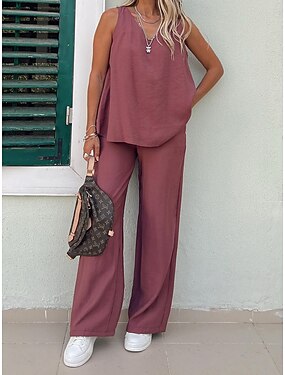 Femmes Ensembles en coton et lin Ensembles de Pantalons Sans manches Col en V Uni Patchwork Élégant Mode Streetwear Occasionnel Quotidien Extérieur Vin Bleu Roi Beige Été Coupe Ample