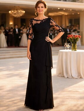 Fourreau Colonne Longueur au sol Robe d'invité de mariage Robe de Cérémonie Robe de soirée Robe de Mère de Mariée Demi Manches Col Bateau Grande taille robe demoiselle d honneur Chiffon Dentelle avec