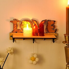 Étagère décorative en bois à monter soi-même, ornée d'un animal de dessin animé et des lettres « amour » et « maison », idéale pour décorer un mur ou exposer dans un salon.