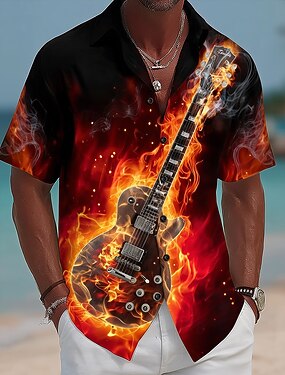 Homme Guitare Instrument de musique Feu Chemise Chemise Boutonnée Chemise à col camp Manche Courte Vintage Rétro Festival de Musique Fête Été Printemps Col cubain Impression 3D Noir / Orange Orange