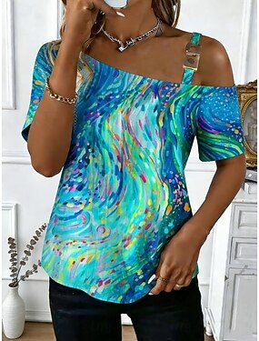 Femmes T-shirt Imprimé Graphique Abstrait Mode Classique Occasionnel Manche Courte Une Épaule Hauts Réguliers Quotidien Sortir Week-end Bleu Rose Claire Violet Été Printemps