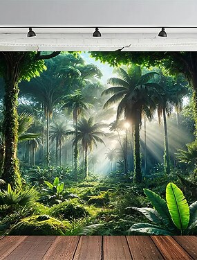 Tapisserie murale représentant une forêt tropicale humide, un paysage de jungle et de nature avec des palmiers verts et des rayons de soleil, idéale pour décorer un salon, une chambre ou une chambre