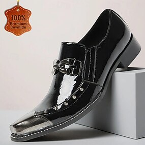 Mocassins pour hommes en cuir verni noir, élégants avec boucle dorée, chaussures de luxe à enfiler pour les occasions formelles et spéciales.