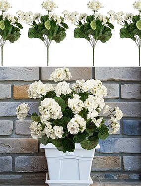 4 branches de géraniums blancs artificiels résistants aux UV, 4 géraniums en fleurs, convenant à la décoration intérieure et extérieure, aux jardins, aux mariages, à Thanksgiving, à Noël et aux fêtes