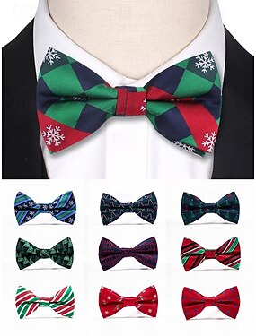 Nœud papillon de Noël pour homme en polyester, orné de flocons de neige et de sapins, disponible en rouge, vert et bleu marine.
