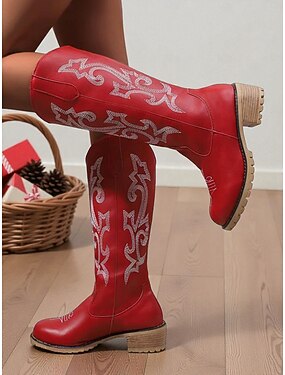 Bottes de cowboy rouges pour femmes avec détails brodés – élégantes bottes hautes d'inspiration western, idéales pour Noël, l'automne et les événements hivernaux