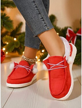 Mocassins rouges à pompons pour femmes - chaussures en fourrure douce et duveteuse ornées de détails de Noël pour une détente hivernale confortable et des cadeaux de fêtes