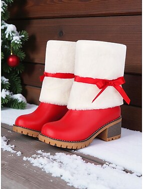 Bottes d'hiver rouges à talons carrés pour femmes – bottes inspirées du Père Noël, bordées de fausse fourrure et ornées de rubans, parfaites pour les fêtes de Noël, les soirées et le streetwear.