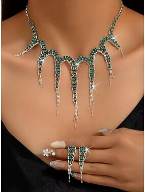 Parure de bijoux femme strass vert avec collier et bagues pour fête de Noël, bal &événements en soirée