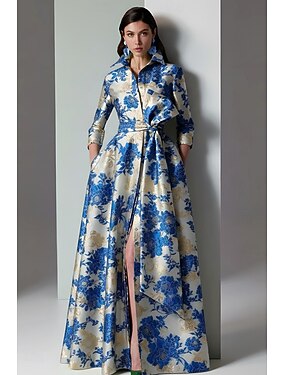 Ligne A Longueur cheville Robe Chemise Robe de Cérémonie Robe de Mère de Mariée manche longue Col de chemise Élégant ancien Formel Jacquard avec Noeud(s) Broderie Fleur