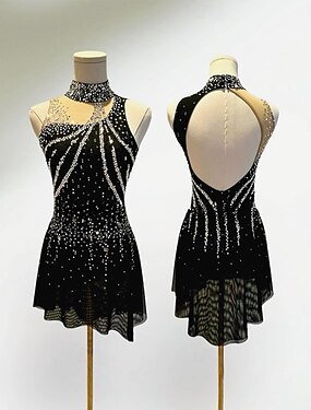 Robe de patinage artistique Femmes Fille Patinage Robe Noir Patchwork Ourlet asymétrique Spandex Maille Haute Élasticité Entraînement Compétition Tenue de Patinage Classique cristal pailleté Sans