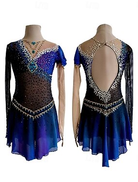 Robe de patinage artistique Femmes Fille Patinage Robe Bleu Noir Patchwork Dos Nu Maille Spandex Haute Élasticité Entraînement Compétition Tenue de Patinage Classique cristal pailleté manche longue