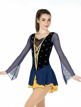 Robe de patinage artistique Femmes Patinage Robe Noir bleu. Patchwork Haute Élasticité Entraînement Compétition Tenue de Patinage Classique cristal pailleté manche longue Patinage sur glace Patinage