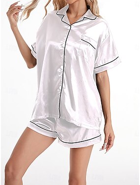 Femmes Loungewear Ensemble Pyjama Mode Simple Occasionnel Couleur Unie Pyjama en satin soyeux Taille Élastique Shorts Maison Vacances Manche Courte Col de chemise Bleu Noir Blanche Champagne Rouge