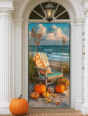 Décoration murale automnale pour la porte d'entrée ou le porche : bannière de porte sur le thème de la plage, citrouille, étoile de mer et paysage marin, idéale pour décorer une chaise Adirondack ou