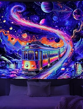 Tapisserie murale galaxie à lumière noire, tapisserie planète réactive aux UV, tapisserie train psychédélique, tapisserie paysage fantastique, tapisserie nébuleuse univers néon pour chambre